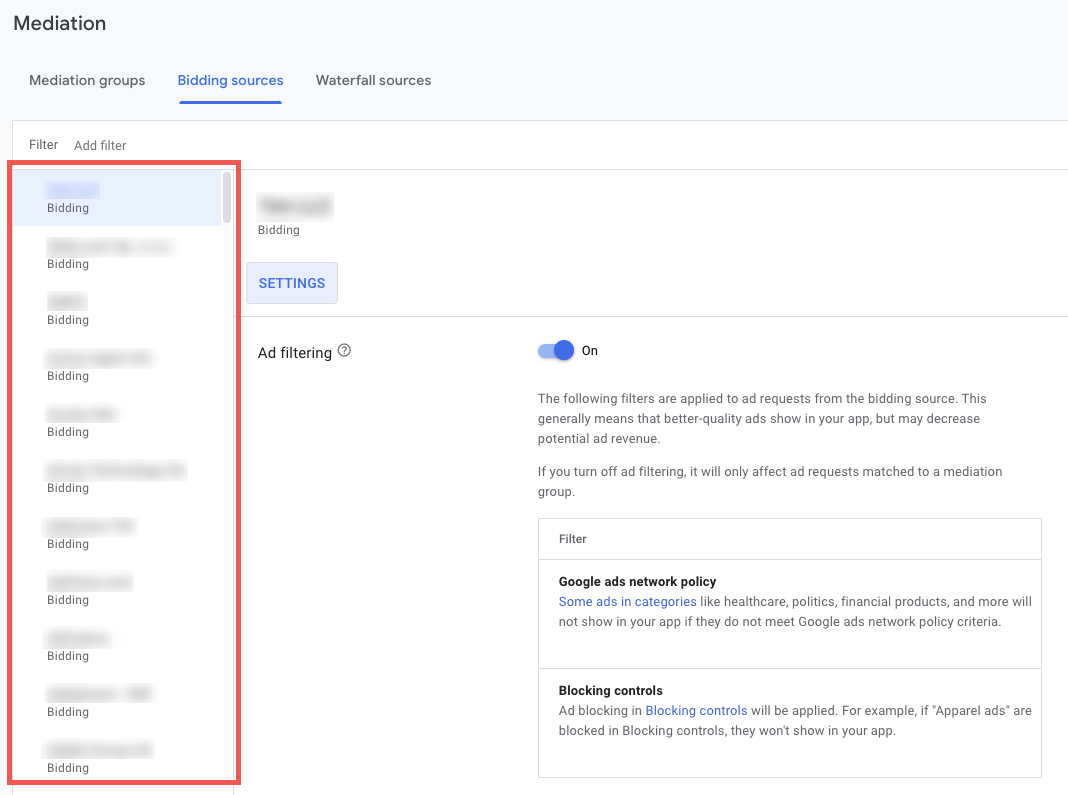 You can now adjust the ad filtering settings for eligible bidding ad sources. This means that you can decide whether to apply the Google Ads network policy and your blocking controls to a specific bidding ad source.