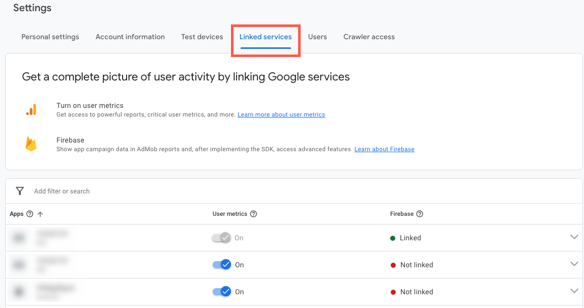 We’re introducing a comprehensive way to manage linking to additional Google services in your AdMob account. The Linked services page allows you to turn on user metrics and link your apps to Firebase from a single page in your AdMob account.