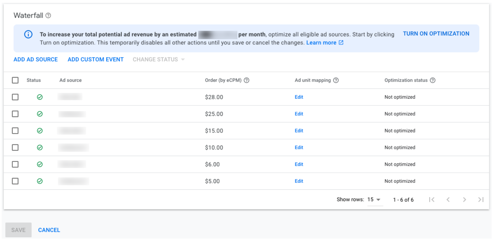Turning on optimization allows AdMob to adjust the eCPM of a waterfall ad source. This means that optimized ad sources are dynamically placed in the mediation waterfall based on historical data from the ad source and your app’s traffic.