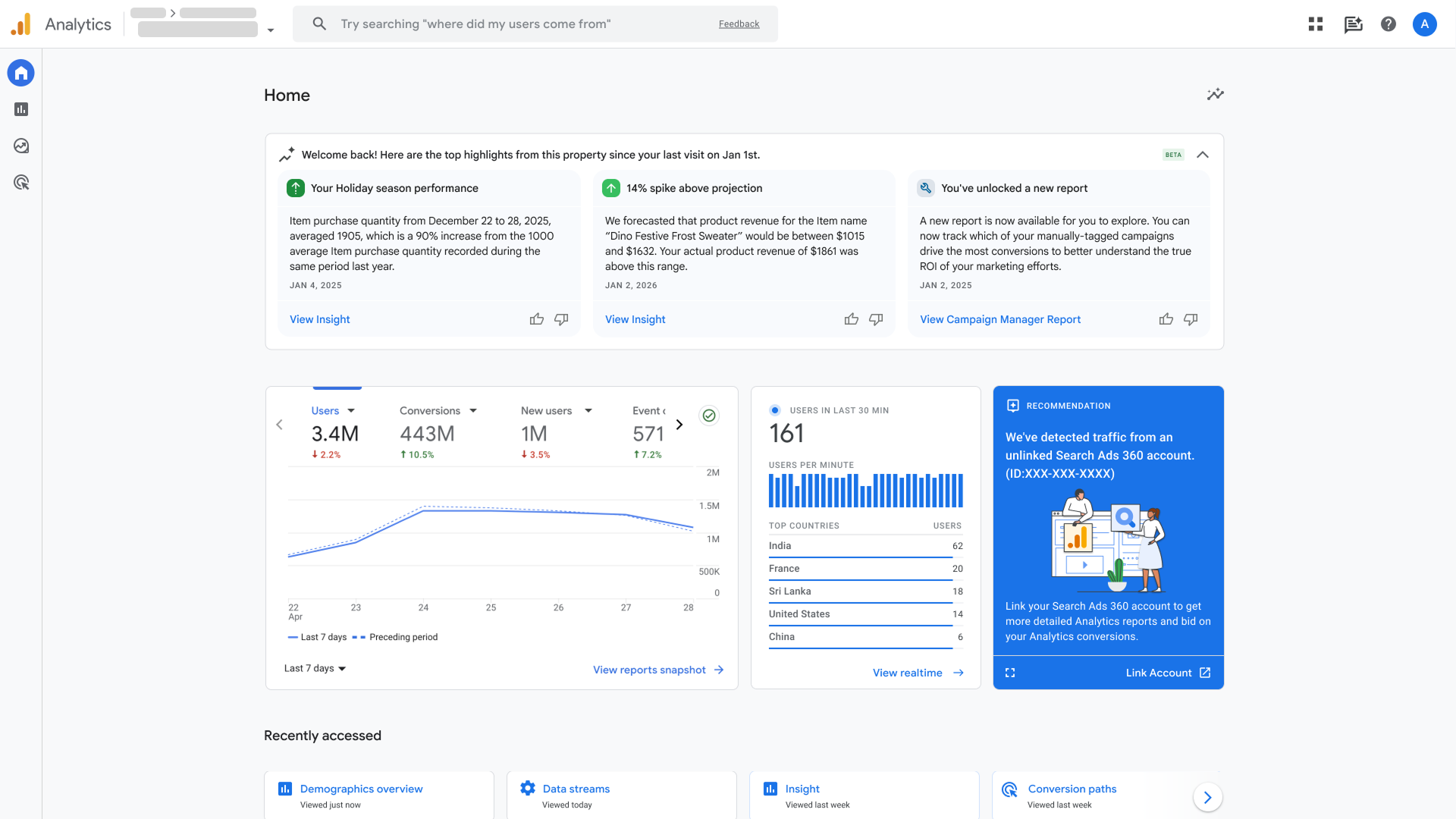 Generated insights on the Google Analytics Home page provides a concise, AI-generated overview of the most critical changes to your data since your last visit. Designed to improve data discoverability, this feature highlights key developments such as completed Google Ads or Search Console integrations, significant traffic anomalies, and seasonality changes. By surfacing these updates on the Home page, the feature helps you quickly prioritize urgent issues or opportunities without manually digging through your data.