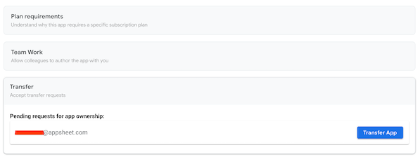 You can transfer apps between AppSheet accounts. This is useful if you created an app under one account but wish to transfer it to another account. For example, you may have developed a new application under your own personal AppSheet account but want to deploy the application under another AppSheet account where all deployed applications reside. Having an AppSheet account where all deployed applications reside often makes administration easier.