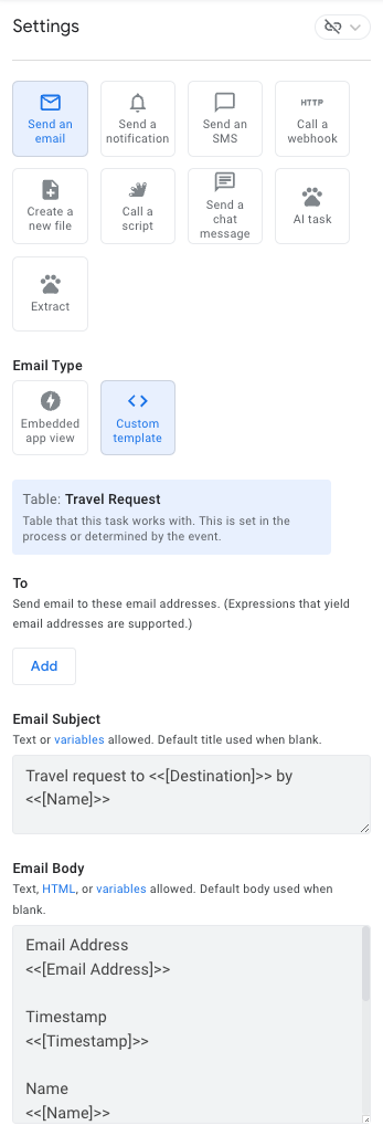 - In the Email Subject field, enter: Travel request to <<[Destination]>> by <<[Name]>>