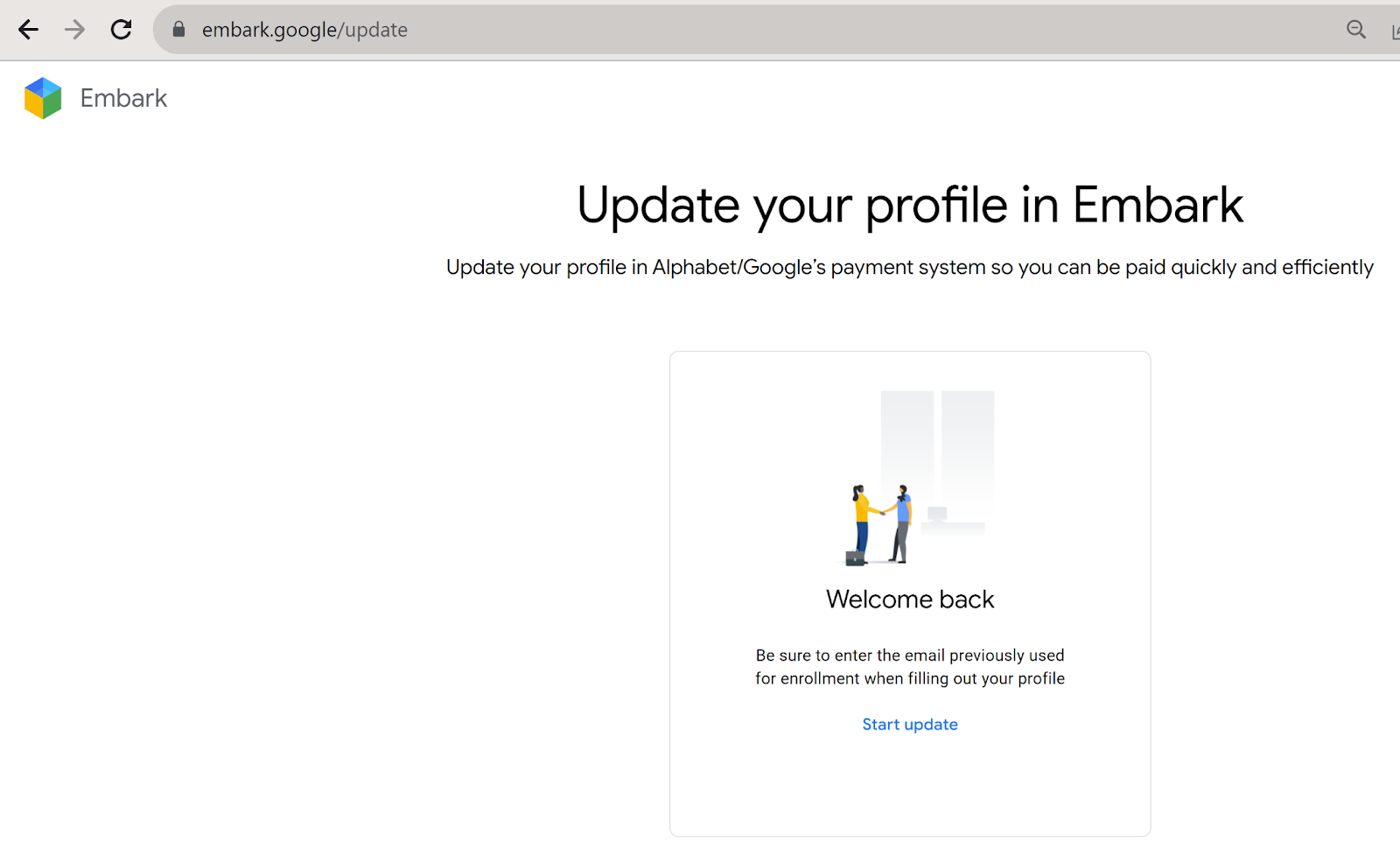 - Click Start Update on https://embark.google/update. (Make sure your pop-outs are enabled, and a new window will appear.)
