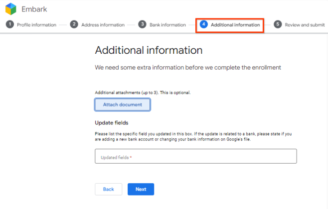 Once your details are successfully submitted via Embark, Alphabet/Google team will perform necessary validation and verification for extra precautions. As part of this process, additional approvals and verification may be required before the proposed changes reflect on a supplier's record.
