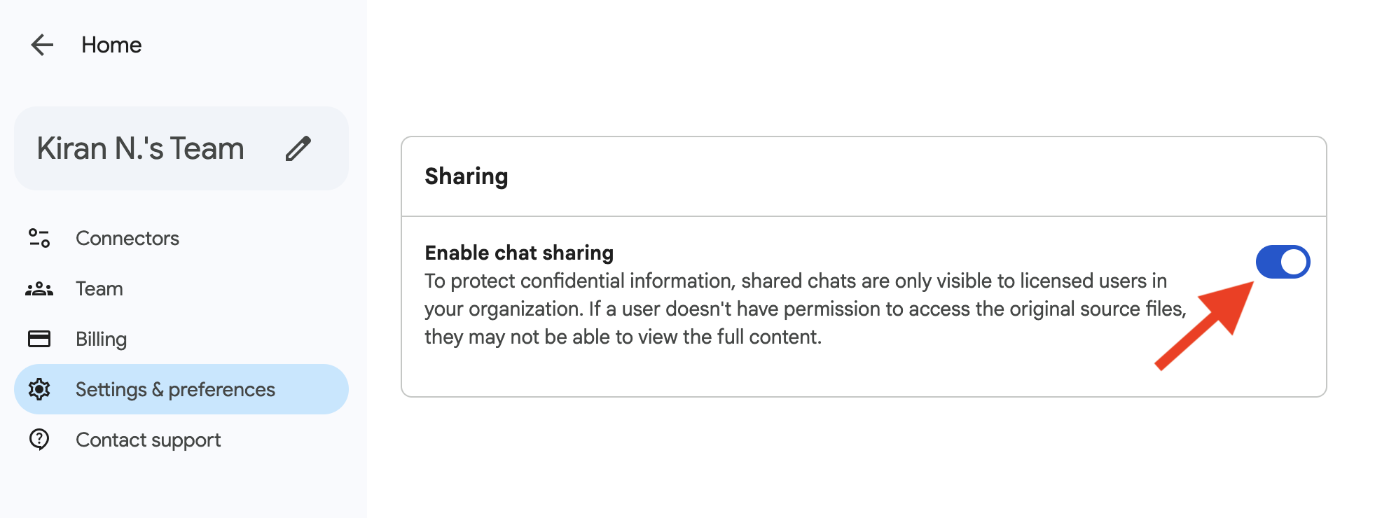 To enable or disable chat sharing among your Gemini Enterprise – Business edition team: