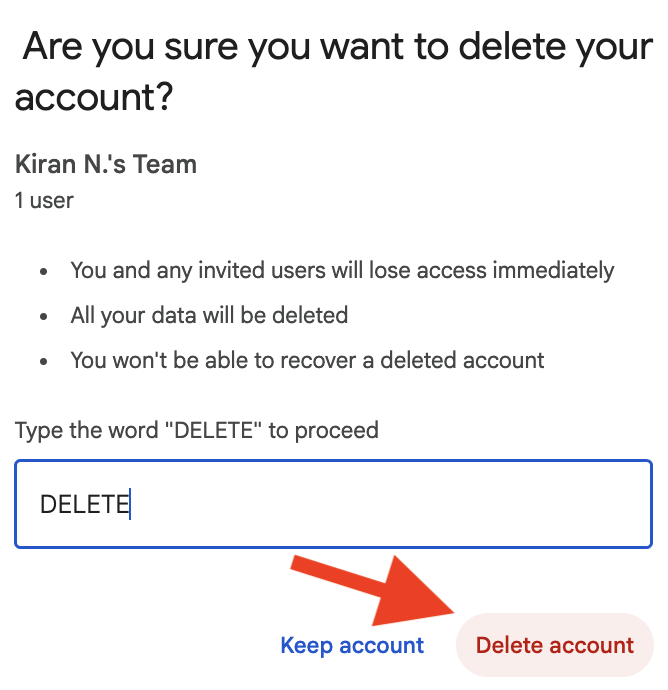 By deleting your account, you and any invited users will lose access immediately. All your data will be deleted, and you won't be able to recover a deleted account.