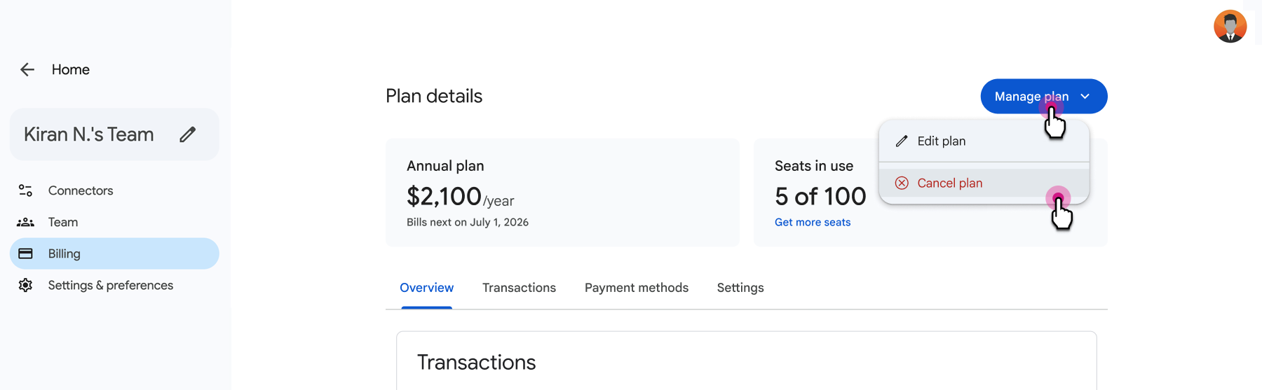- Select Manage plan, then choose Cancel plan.