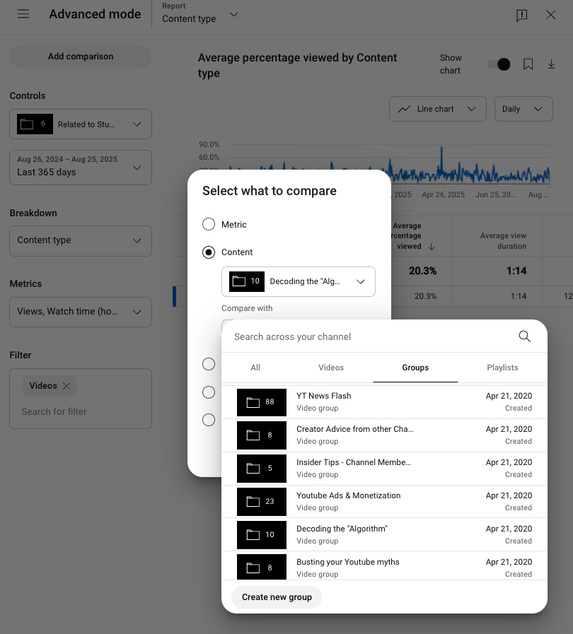 - Group across content pillars: See how all your videos on "DIY Projects" perform against all your videos on "Unboxing” content.