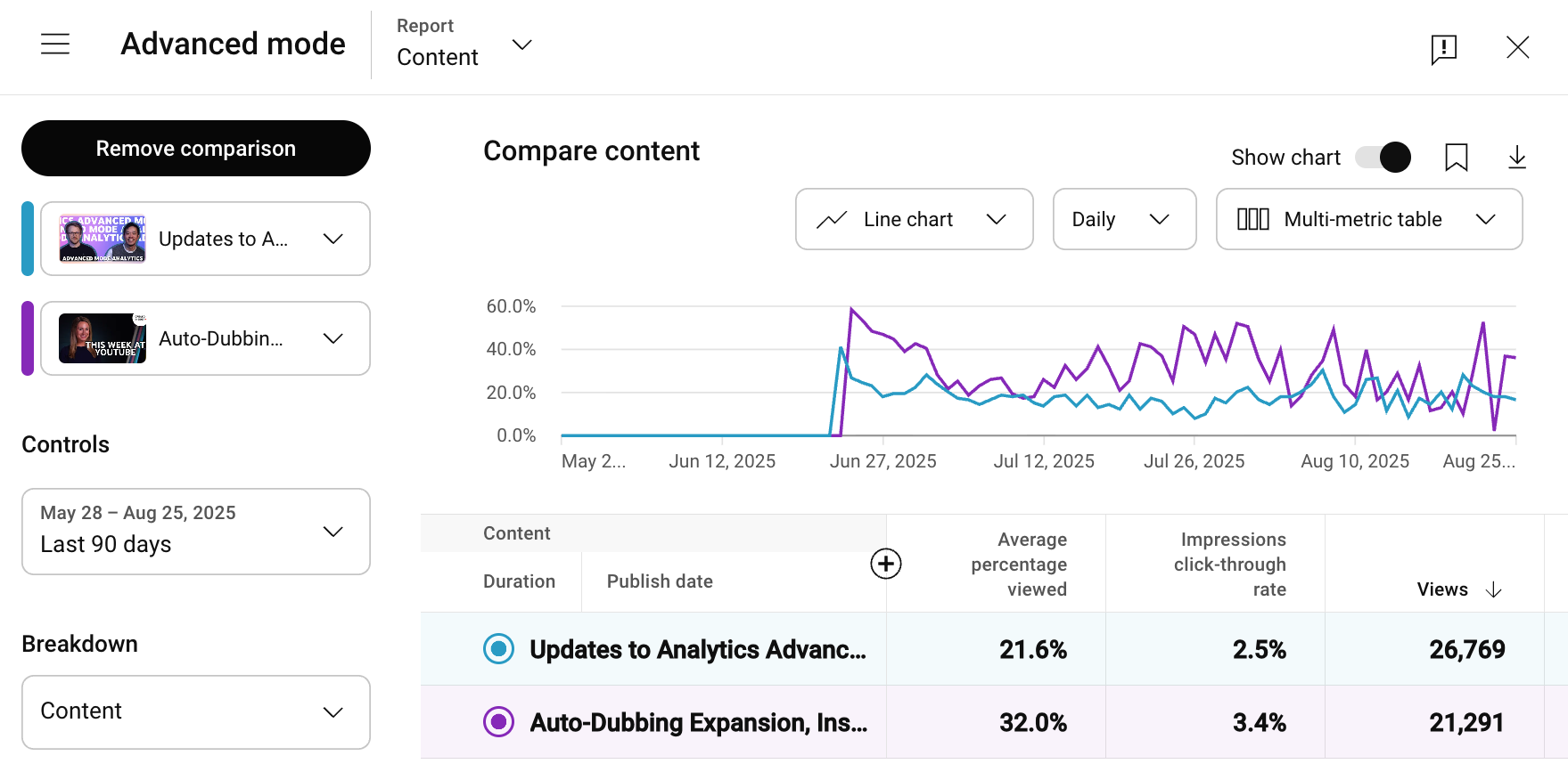 - Compare a top-performing video with a bottom-performing video from the same content series. Analyze the difference in CTR, audience retention and traffic sources to identify what made one video more successful.